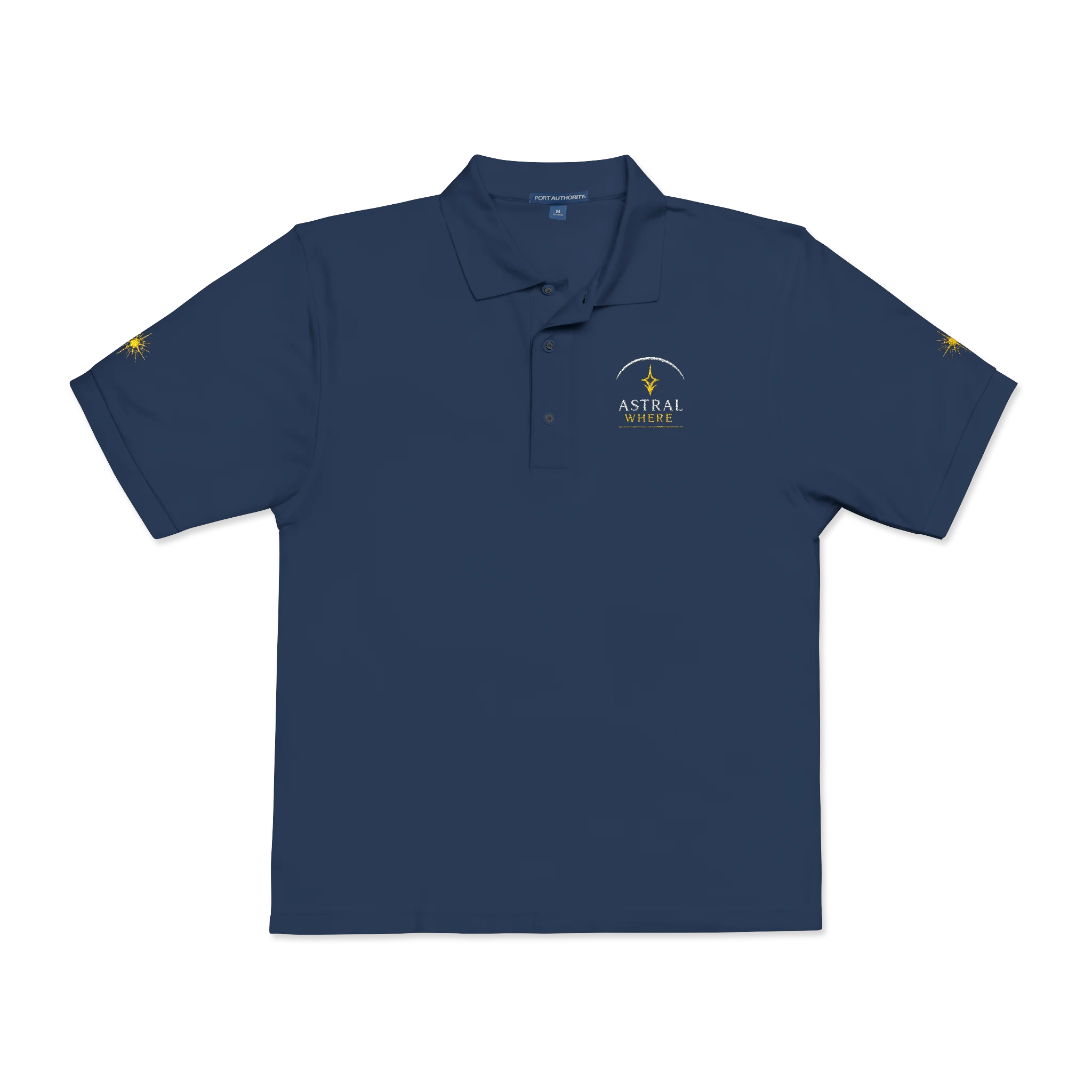 The logo polo shirt just has our Astral Where mark small, tonal, easy to miss. We don’t need to scream our name. If someone asks, great. If not, you’re just wearing a really good polo. No awkward plastic tags either. Just soft fabric and a clean neckline.